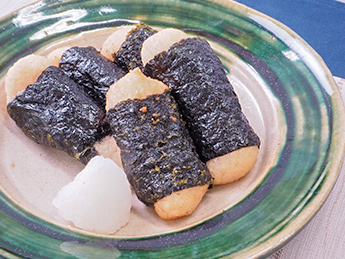 大和芋特有の強い粘り気を生かして外はカリカリで中はふわふわにし、海苔を巻いて揚げました。